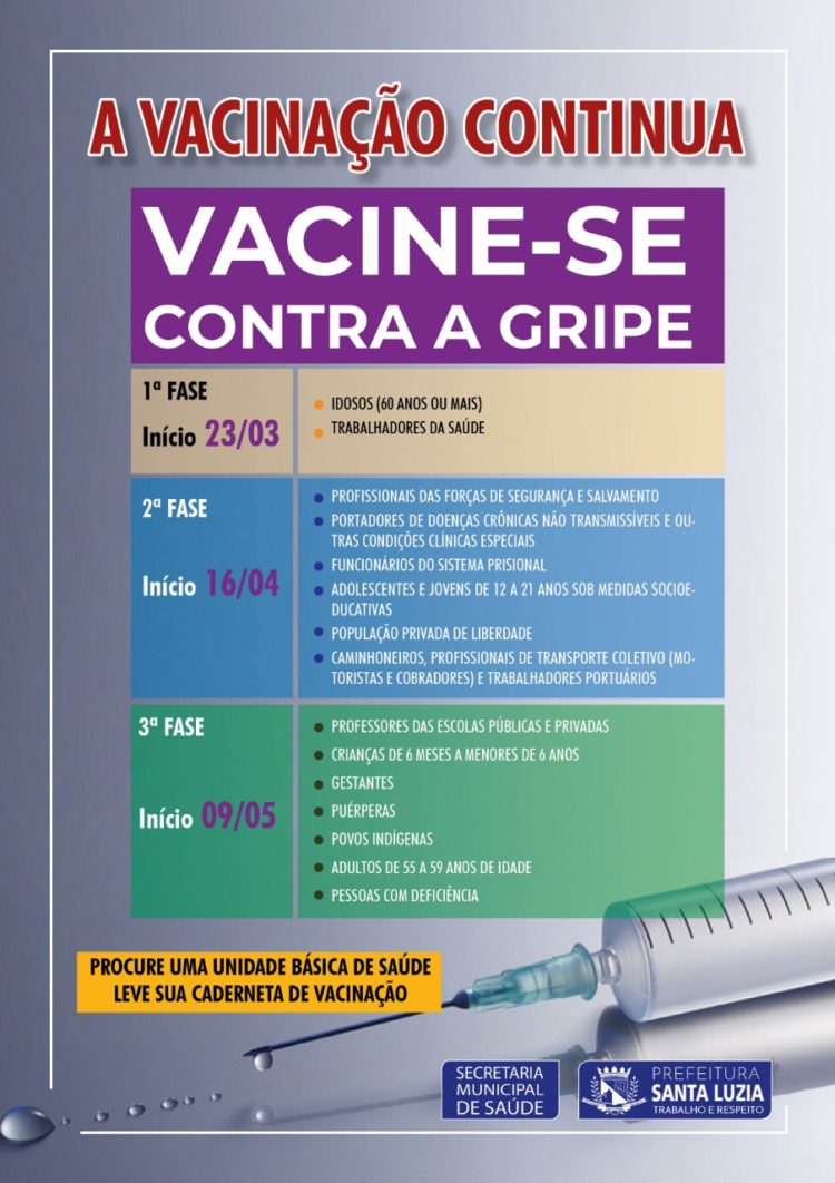 A prefeitura de Santa Luzia iniciou nesta quinta-feira (16) a segunda fase da campanha de vacinação contra a gripe. Na primeira etapa foram vacinados os idosos e profissionais de saúde, agora é a vez de imunizar portadores de doenças crônicas não transmissíveis (esses precisam levar no dia da vacinação, documento comprobatório, como prescrição ou relatório médico), profissionais de segurança,  detentos, adolescentes e jovens de 12 a 21 anos (sob cumprimento de medidas socioeducativas), caminhoneiros, motoristas de transporte coletivo e portuários.