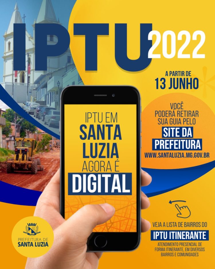 A Prefeitura de Santa Luzia, por meio da secretaria Municipal de Finanças lança nesta quarta-feira (8), o IPTU 2022 100% digital.  A emissão das guias do Imposto Predial e Territorial Urbano estará disponível a partir da próxima segunda-feira (13), no site oficial da Prefeitura (link) e terá vencimento no dia 11 de julho.   Este ano, a guia não será enviada pelos correios e pode ser solicitada também pelo e-mail tributos@santaluzia.mg.gov.br . A medida tem como objetivo gerar economia e conforto para os contribuintes.