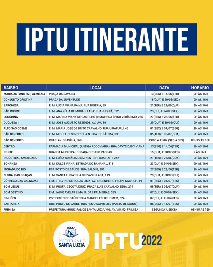 Com o intuito de prestar auxílio para toda a população na emissão das guias para pagamento, a administração municipal realizará atendimento presencial de forma itinerante em diversos bairros da cidade, para emissão das guias do IPTU Digital 2022.  O atendimento nos pontos itinerantes será do dia 13 de junho a 11 de julho de 2022, das 9h às 12h e das 13h às 16h.
