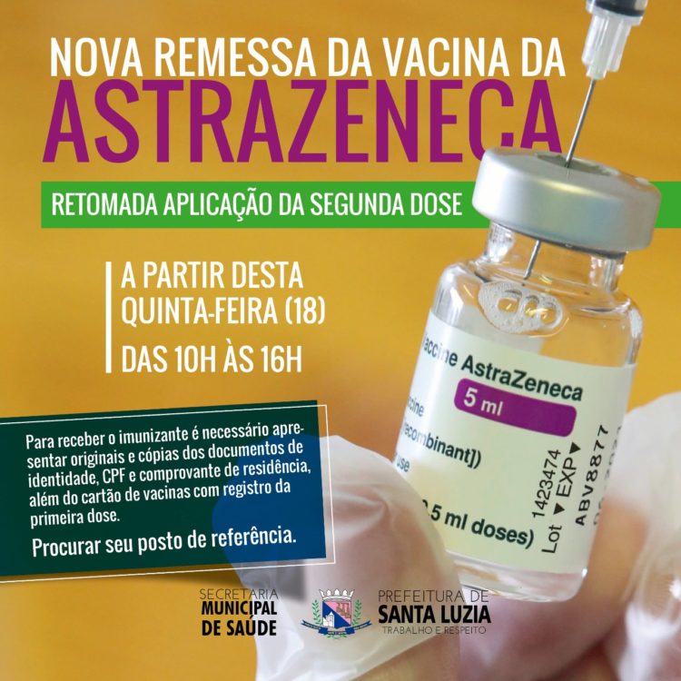 As pessoas que estiverem com aplicação da segunda dose da vacina do laboratório da Astrazeneca em atraso podem procurar a unidade básica de saúde de referência para completar o esquema vacinal, a partir desta quinta-feira (18), das 10h às 16h.