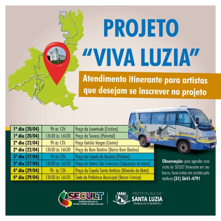 Para participar do edital de chamamento público “Viva Luzia”, os profissionais da arte e cultura deverão preencher o formulário: “Cadastro Permanente da Cadeia Produtiva da Arte, Cultura e Turismo”. O cadastramento é um pré-requisito para a participação no projeto. E para prestar esclarecimentos e auxiliar no cadastro dos artistas, a SECULT, realizará a partir da próxima terça-feira (20), o atendimento itinerante, que será iniciado na Praça da Juventude, no bairro Cristina pela manhã, e na Pracinha da Savassi, no bairro Palmital, no período da tarde. Confira o cronograma abaixo com todos os bairros agraciados. Para agendar uma visita do SECULT Itinerante em seu bairro, favor entrar em contato com pelo telefone (31) 3641-4791. Mais informações: bit.ly/3sEerMs