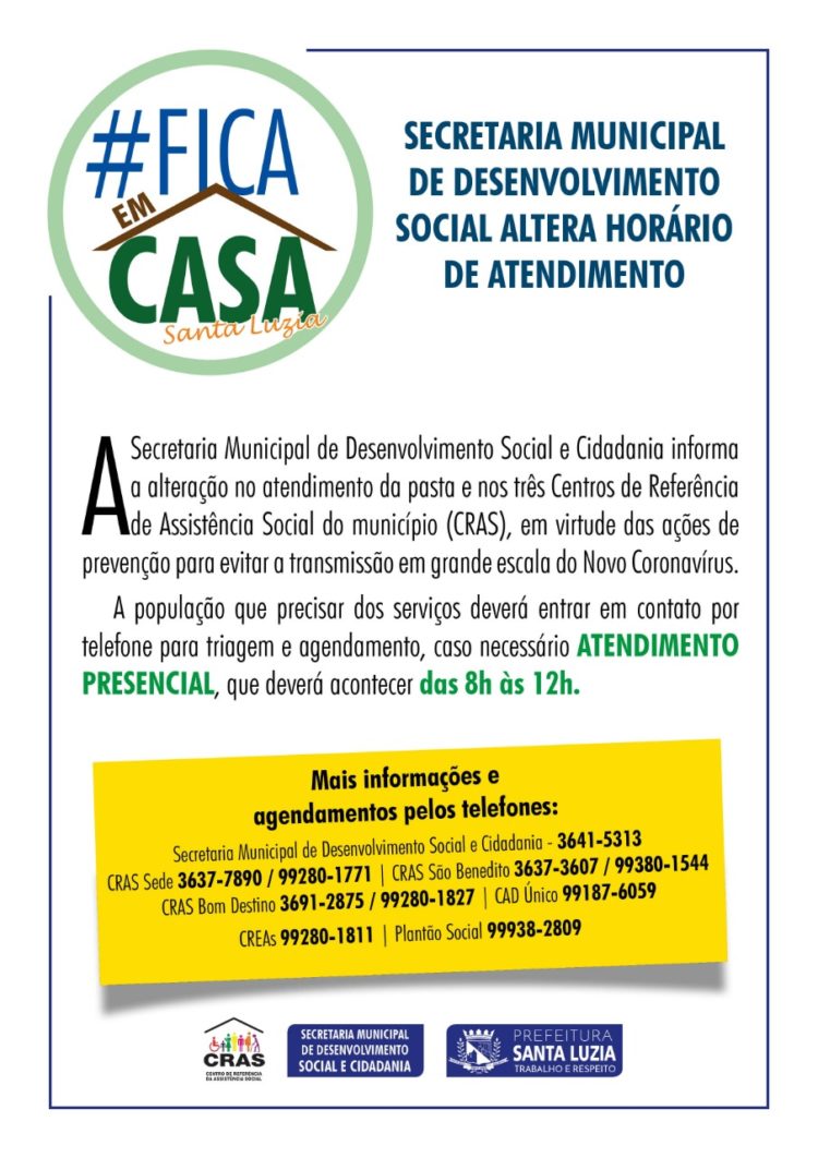 A Secretaria Municipal de Desenvolvimento Social e Cidadania informa a alteração no atendimento da pasta e nos três Centros de Referência de Assistência Social do município (CRAS), em virtude das ações de prevenção para evitar a transmissão em grande escala do Novo Coronavírus.
