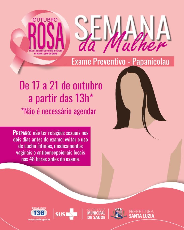 Dentro das atividades relacionadas ao Outubro Rosa, mês temático internacional de conscientização para o controle do câncer de mama, a Prefeitura de Santa Luzia, por intermédio da Secretaria Municipal de Saúde, estará ofertando a partir de segunda-feira (17) exames Papanicolau para prevenção ao câncer do colo do útero. A ”Semana da Mulher” irá até a sexta (21) e os exames estarão disponíveis em todas as 27 unidades básicas de saúde da cidade, sempre a partir das 13h. Não é necessário agendamento.