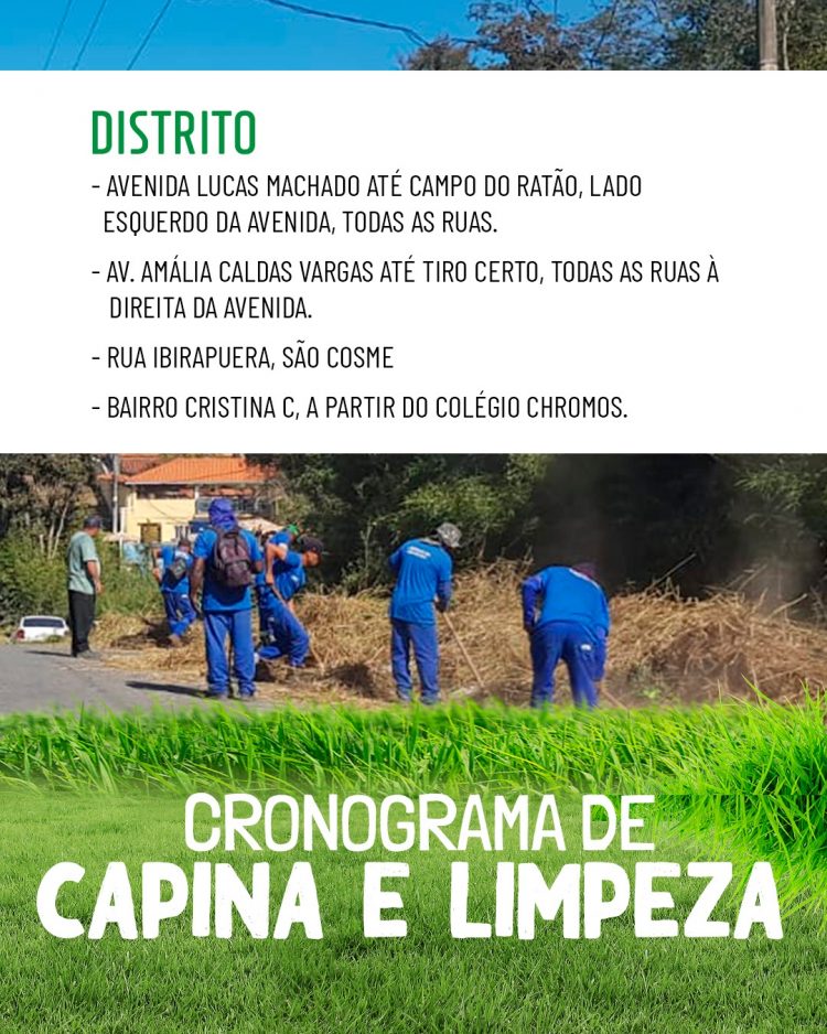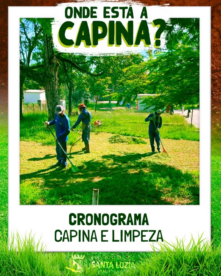 Dando sequência aos trabalhos capina e limpeza que são desenvolvidos semanalmente, a Prefeitura de Santa Luzia está divulgando o cronograma de onde as equipes estarão nos próximos dias. As ações são desenvolvidas tanto na região do distrito de São Benedito, quanto na sede da cidade. Veja abaixo os locais onde acontecem os serviços de segunda (19) a sexta-feira (23).