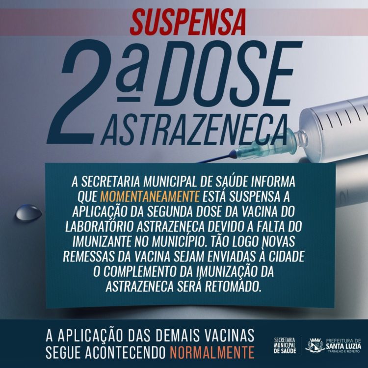 A Prefeitura de Santa Luzia, por meio da secretaria Municipal de Saúde informa que momentaneamente está suspensa a aplicação da segunda dose da vacina do laboratório Astrazeneca devido a falta do imunizante no município. Tão logo novas remessas da vacina sejam enviadas à cidade o complemento da imunização da Astrazeneca será retomado.