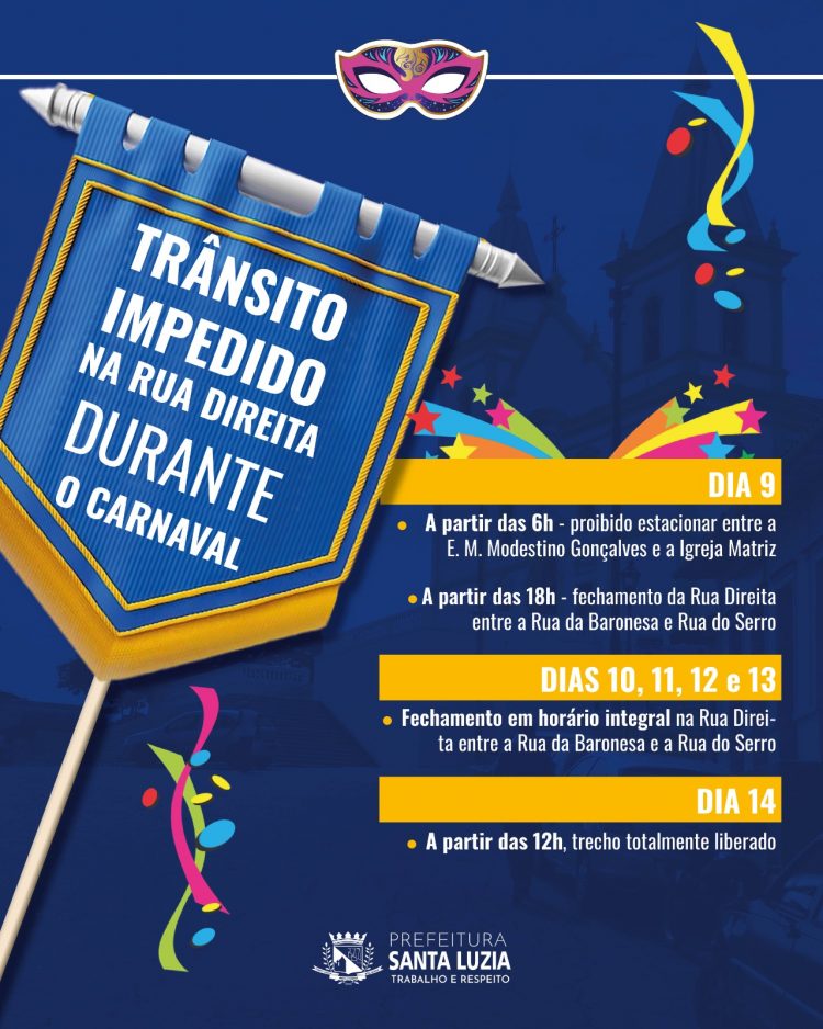 A Prefeitura de Santa Luzia, por meio da Secretaria Municipal de Segurança Pública, Trânsito e Transportes, informa à população que a Rua Direita, entre a Rua da Baronesa e a Igreja Matriz, sofrerá intervenções entre os dias 9 e 14 de fevereiro, para a programação de blocos de rua durante o Carnaval. As medidas têm como objetivo garantir o desfile seguro dos foliões e também preservar a mobilidade, minimizando os impactos para quem precisa se deslocar pela região.