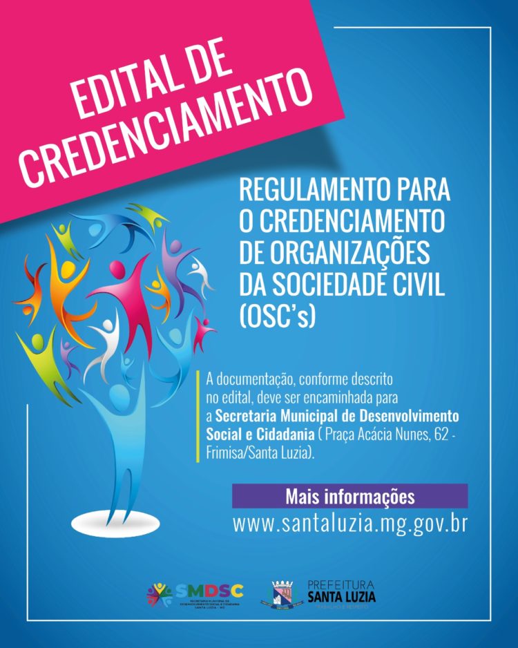 A prefeitura de Santa Luzia, por meio da Secretaria de Desenvolvimento Social e Cidadania publicou na última sexta-feira (5), o edital que estabelece as regras para o credenciamento das Organizações da Sociedade Civil (OSC’s) que executam ou possuem experiência na execução de serviços socioassistenciais, conforme definido pela Lei Federal nº 13.019/2014 e pelo Decreto Municipal nº 3.315/2018.