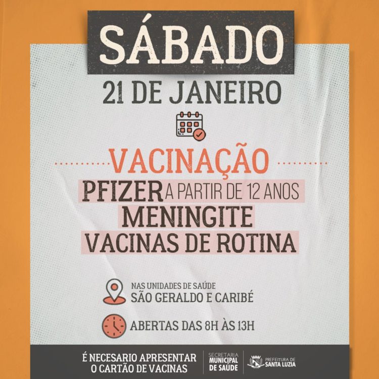 As unidades básicas de saúde Caribé e São Geraldo estarão abertas das 8h às 13h, no sábado (21) para atender a população com as vacinas contra a covid-19, meningite C e vacinas de rotina. A medida é importante e permite que a população atualize o cartão de vacina e mantenha a imunização em dia contra as doenças. A vacina para covid-19 estará disponível para o público a partir de 12 anos. O imunizante para meningite C estará disponível para trabalhadores da Saúde, estudantes universitários, trabalhadores de faculdades, sendo universidades e escolas técnicas e, ainda, todas as pessoas de 16 a 30 anos de idade.
