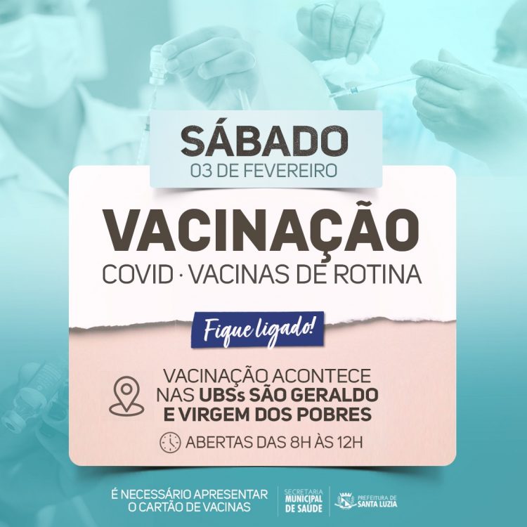 Assim como acontece semanalmente, as unidades básicas de saúde Virgem dos Pobres e São Geraldo estarão abertas neste sábado (3), das 8h às 12h, para vacinação contra a covid-19 e outras vacinas de rotina. Lembrando que é necessário apresentar o cartão de vacinas e crianças e adolescentes menores de 18 anos precisam estar acompanhados dos pais ou responsáveis.