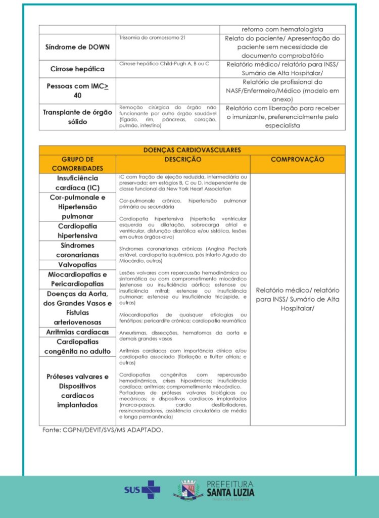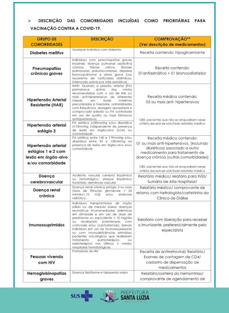 A lista de comorbidades a serem contempladas inclui 24 enfermidades e a documentação específica exigida para a comprovação de cada uma delas pode ser consultada junto aos profissionais das UBSs ou na tabela abaixo:
