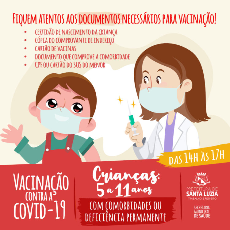 A vacinação contra a covid-19 para o público infantil começa nesta quarta-feira (19) em Santa Luzia. É importante que pais e responsáveis estejam atentos aos documentos necessários para a aplicação da vacina. Além dos documentos já divulgados (certidão de nascimento da criança, cópia do comprovante de endereço, cartão de vacinas e documento que comprove a comorbidade/ deficiência) é preciso apresentar também o CPF ou cartão do SUS do menor.