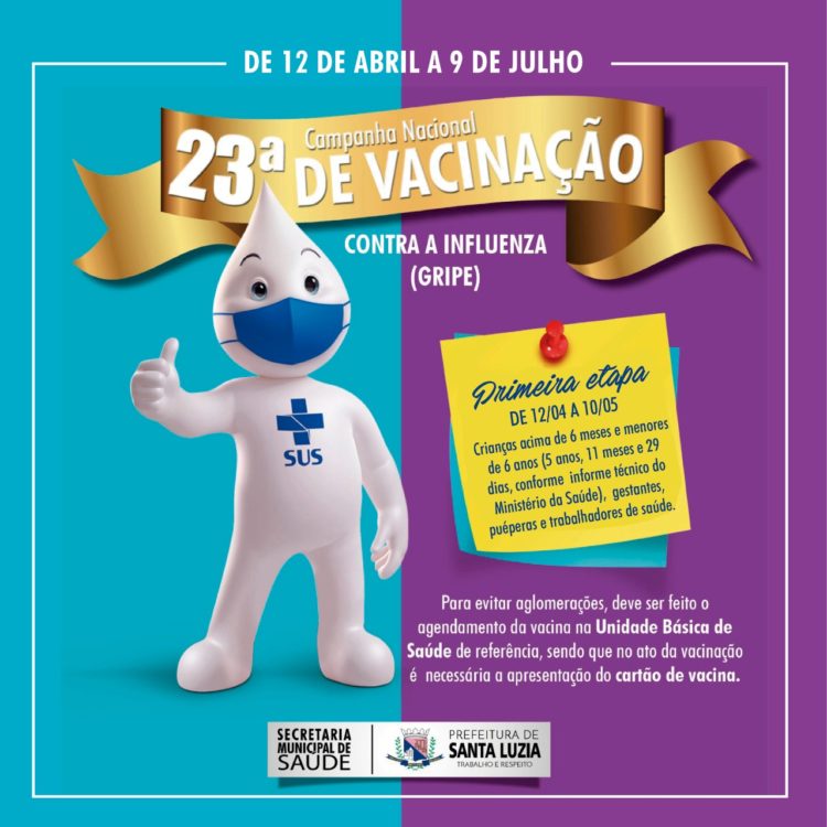 A 23ª campanha de vacinação contra a gripe está sendo realizada em todas as Unidades Básicas de Saúde de Santa Luzia. No momento, está sendo realizada a primeira fase da campanha, com aplicação das vacinas no público-alvo composto por crianças acima de 6 meses e menores de 6 anos (5 anos, 11 meses e 29 dias conforme informe técnico do Ministério da Saúde), gestantes, puérperas e trabalhadores de saúde, sendo que para estes profissionais é obrigatório comprovar vínculo de trabalho, apresentando no ato da vacinação, registro profissional e da carteira ou contrato de trabalho em estabelecimento de saúde e cópia dos documentos apresentados.