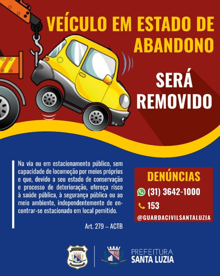 Por intermédio da Secretaria de Segurança Pública, Trânsito e Transportes, a Prefeitura de Santa Luzia informa que veículos que se encontrarem em vias ou estacionamentos públicos em estado de abandono, sem capacidade de locomoção por meios próprios e que, devido ao seu estado de deterioração ofereçam risco à saúde pública, à segurança pública ou ao meio ambiente serão removidos para os pátios municipais. A remoção se fará pela Guarda Civil Municipal e será realizada ainda que o veículo se encontre estacionado em local permitido.