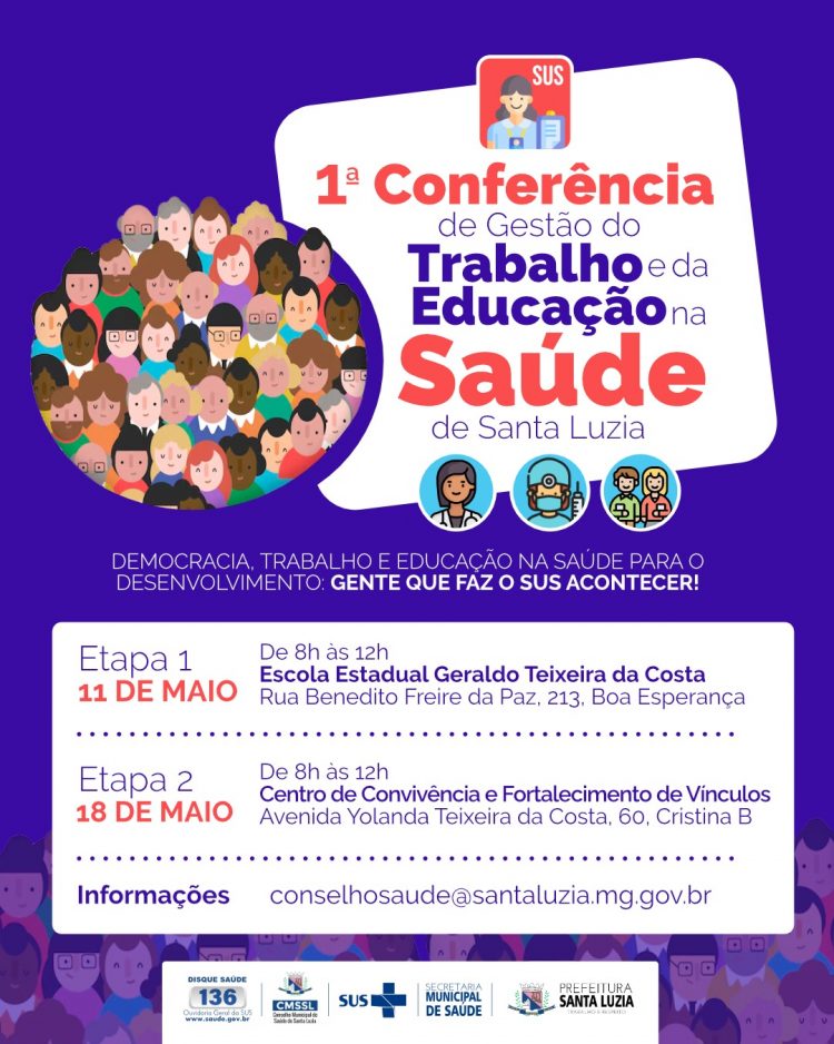 Convocada pelo Conselho Municipal de Saúde de Santa Luzia e coordenada por sua Comissão Organizadora, a 1ª Conferência de Gestão do Trabalho e da Educação na Saúde de Santa Luzia CGTES será realizada em duas etapas, sendo: uma na Regional Sede, e a outra na Regional São Benedito; das 8h às 12h, nos dias 11 e 18 de maio, respectivamente, ambos sábados.