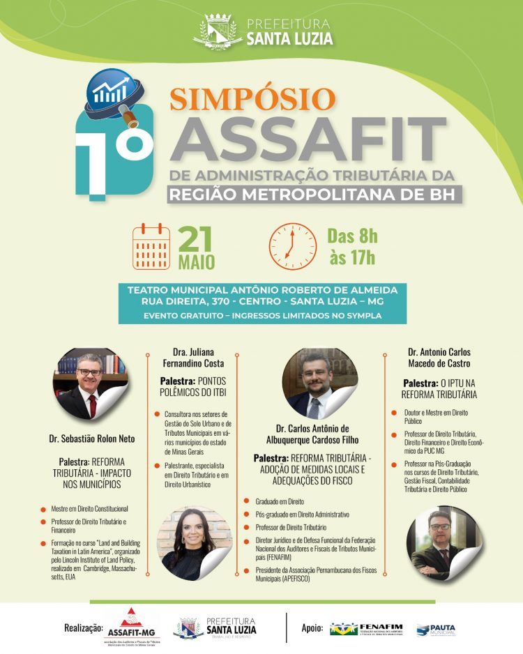 O município de Santa Luzia sediará o I Simpósio de Administração Tributária da Região Metropolitana de Belo Horizonte na terça-feira, 21 de maio de 2024. O evento será realizado no Teatro Municipal Antônio Roberto de Almeida e contará com palestras de advogados especialistas em tributação. O simpósio está sendo organizado pela Associação dos Auditores e Fiscais de Tributos Municipais de Minas Gerais (ASSAFIT) em parceria com a Prefeitura de Santa Luzia.