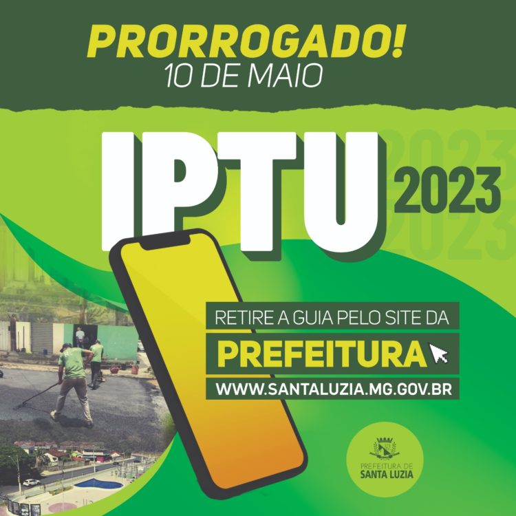 A Prefeitura de Santa Luzia está prorrogando o prazo para pagamento do IPTU 2023. Agora, o tributo pode ser pago até o dia 10 de maio. As guias para o pagamento estão disponíveis no site (www.santaluzia.mg.gov.br) e nos pontos físicos: setor de Tributos dentro da prefeitura (avenida Oito, 50, Frimisa) e no CRAS São Benedito (avenida Brasília, 560), das 8h15 às 16h.