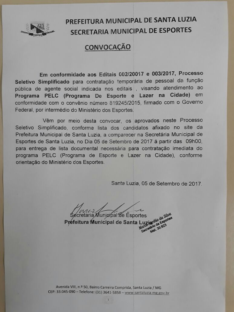 CHAMAMENTO PARA TREINAMENTO DOS APROVADOS NO EDITAL Nº01/2018 do PROGRAMA ESPORTE, LAZER DA CIDADE – PELC, MUNICÍPIO DE SANTA LUZIA