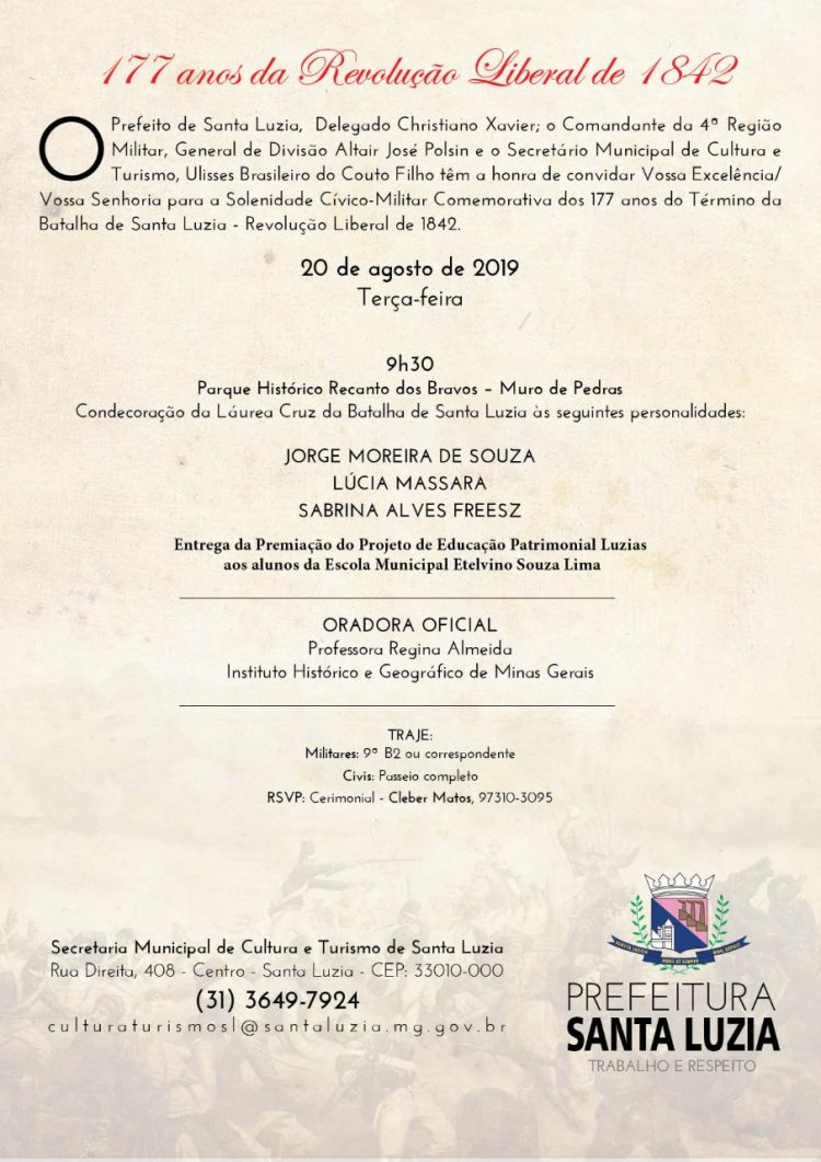A Prefeitura de Santa Luzia, por meio da Secretaria Municipal de Cultura e a 4º Região Militar convidam a todos para o evento que marca os 177 anos do fim da Revolução Liberal de 1842 – Batalha de Santa Luzia.
