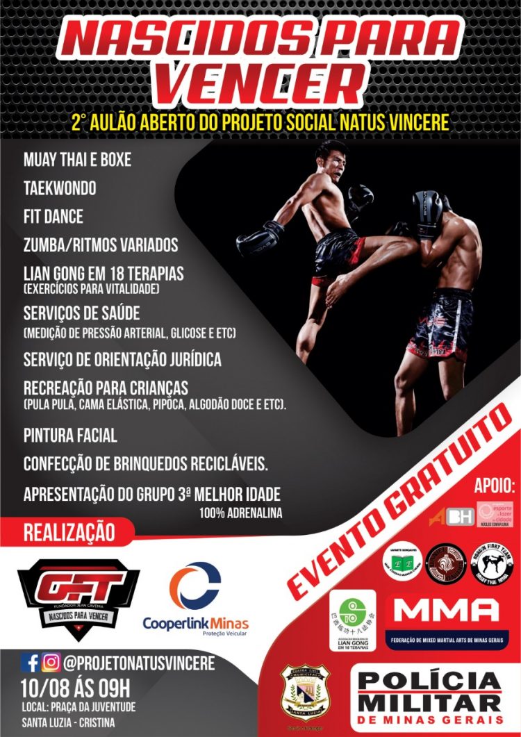 No dia 10 de agosto será realizada mais uma edição do evento “nascidos para vencer”. O 2º aulão aberto faz parte do Projeto Social Natus Vincere e será na Praça da Juventude, no bairro Cristina. O evento tem como objetivo promover esporte, saúde, lazer, segurança, socialização, inclusão social, intervenção social e incentivar a prática esportiva. A participação é gratuita e se iniciará a partir das 9h. A iniciativa tem apoio da Prefeitura de Santa Luzia, por meio da Guarda Civil Municipal.