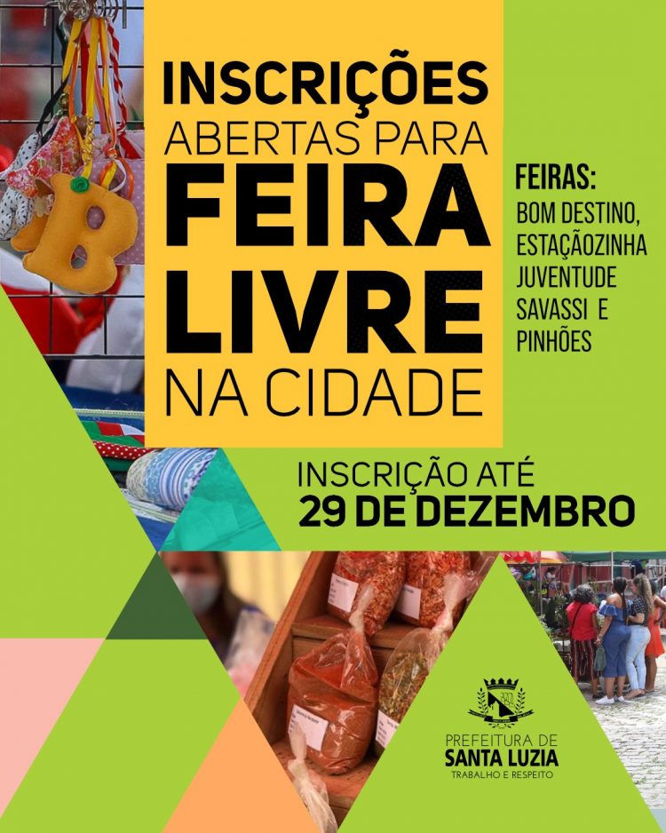 A Prefeitura de Santa Luzia, por meio da Secretaria Municipal de Meio Ambiente, Agricultura e Abastecimento está promovendo um chamamento público para interessados na obtenção do licenciamento para o exercício de atividade comercial nas feiras livres municipais do bairro Bom Destino, Praça da Estaçãozinha (bairro São João Batista), Praça da Juventude (bairro Cristina), Praça da Savassi (bairro Palmital) e Praça de Pinhões. As inscrições devem ser feitas até o dia 29 de dezembro.