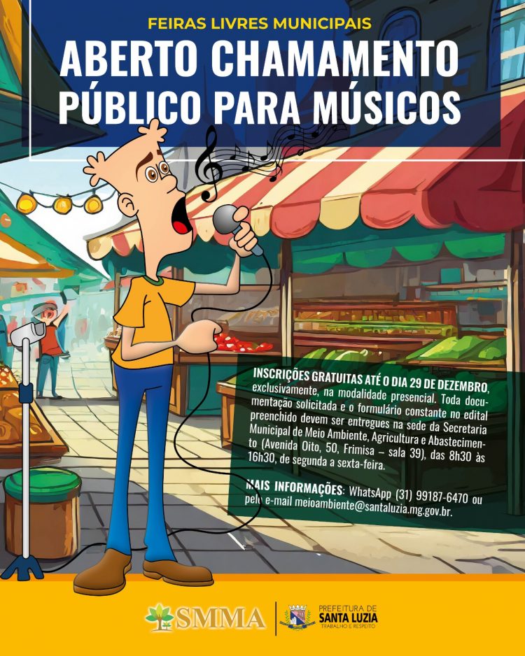 A Prefeitura de Santa Luzia, por meio da Secretaria Municipal de Meio Ambiente, Agricultura e Abastecimento está realizando um chamamento público para cadastramento e seleção de artistas do segmento musical, preferencialmente, moradores da cidade de Santa Luzia, para execução de apresentações musicais durante as feiras livres municipais, ao longo do ano de 2024. O objetivo é proporcionar aos frequentadores maior acesso às atividades culturais, atrair maior público nos espaços e, consequentemente, fomentar o comércio nas feiras.