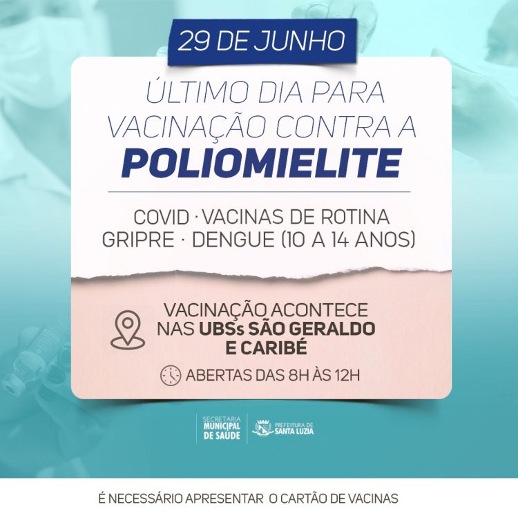 Neste sábado, 29 de junho, duas Unidades Básicas de Saúde (UBSs) estarão abertas das 8h às 12h para oferecer vacinas contra poliomielite, dengue, gripe e covid. As UBSs que estarão disponíveis para a população são São Geraldo e Caribé.