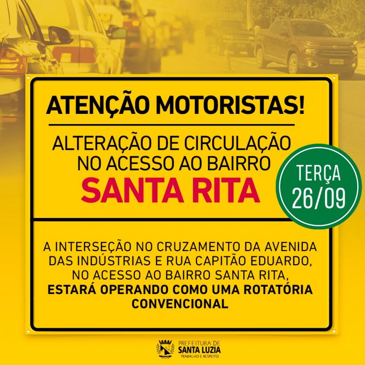 A partir da terça-feira (26), a interseção da Avenida das Indústrias X Rua Capitão Eduardo, no acesso ao bairro Santa Rita, terá sua configuração de circulação alterada. A interseção passará a operar como uma rotatória tradicional, ou seja, a preferência de circulação será oficializada para os veículos que já estiverem inseridos na rótula.