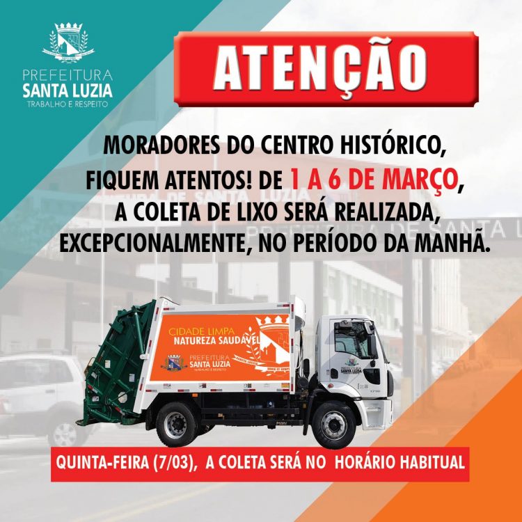 Fiquem atentos! A Prefeitura de Santa Luzia informa que, em função do evento que será realizado no Centro Histórico, de 1 a 5 de março, a coleta de lixo nas ruas: Direita, Cônego Rocha Franco, Benvinda Eugênia da Conceição, do Serro, da Baronesa e José Brígido da Silva será realizada, excepcionalmente, no período da manhã, nos dias 1, 2, 3, 4, 5 e 6 de março. A partir de quinta-feira (7/03), será retomado o horário habitual.