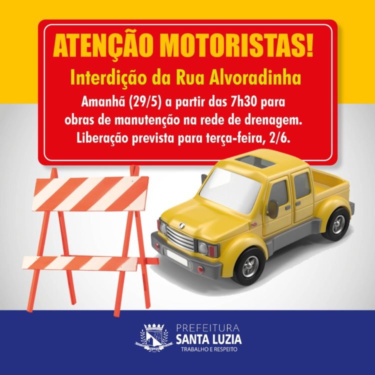 A Prefeitura de Santa Luzia informa que a Rua Alvoradinha, no bairro São Benedito, próxima a UPA São Benedito será interditada a partir da próxima sexta-feira (29), para a realização de obras de manutenção na rede de drenagem. O trecho a ser fechado encontra-se entre a Rua Irmã Celeste e a rotatória da Av. Senhor do Bonfim. A liberação da via está prevista para a próxima terça-feira, 02 de junho. Os motoristas que precisarem trafegar pelo local poderão utilizar as Ruas Bocaiúva e Bom Pastor como rotas alternativas.