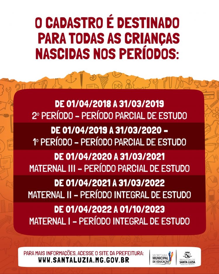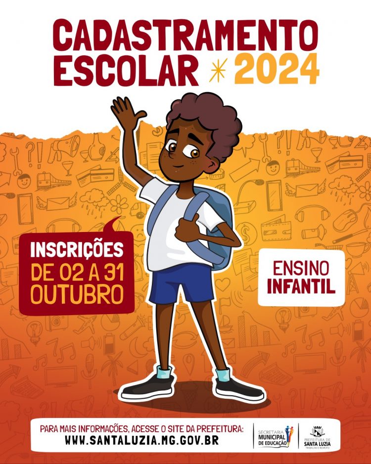 Começa na segunda-feira (2), o Cadastramento Escolar 2024 para a Educação Infantil da Rede Municipal de Ensino de Santa Luzia. As inscrições devem ser realizadas no site da Prefeitura no link: https://bit.ly/educacaoinfantil2024, ou nas Escolas Municipais e UMEIs até o dia 31 de outubro.