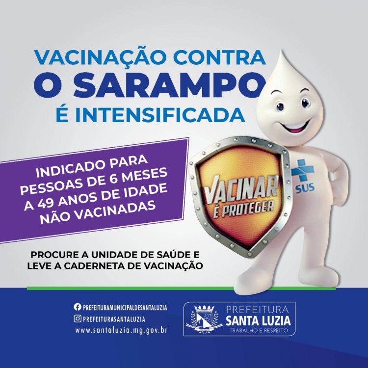 A campanha de vacinação contra sarampo está sendo intensificada. Santa Luzia aderiu a uma determinação do Ministério da Saúde para vacinar bebês de seis a 11 meses e 29 dias com a dose da tríplice viral. A criança deve receber novamente a vacina aos 12 e 15 meses, observando intervalo mínimo de 30 dias. No caso das crianças que vão viajar para municípios que apresentem surto ativo de sarampo, devem ser vacinadas contra a doença pelo menos 15 dias antes da data da viagem.
