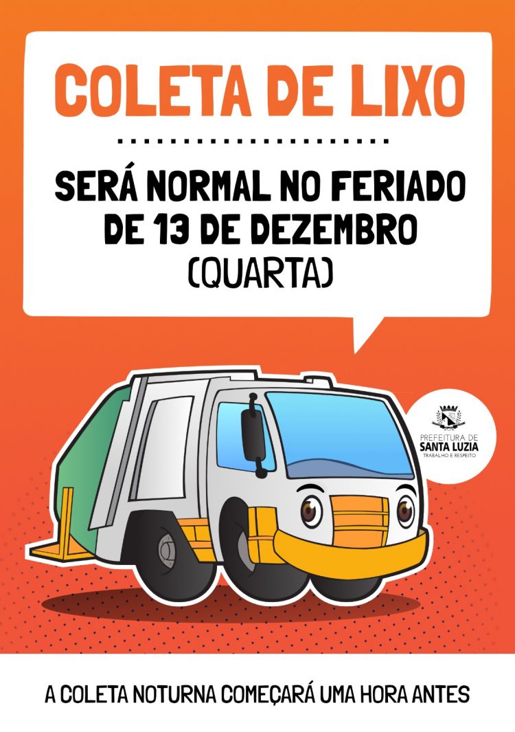 A Prefeitura de Santa Luzia informa que a coleta de lixo funcionará normalmente no feriado de 13 de dezembro, dia de Santa Luzia – Padroeira da cidade, nos locais em que o serviço acontece as segundas, quartas e sextas-feiras. Porém, a coleta noturna começará uma hora antes, portanto, os moradores desses bairros devem ficar atentos, e colocar os resíduos para fora de casa um mais cedo.