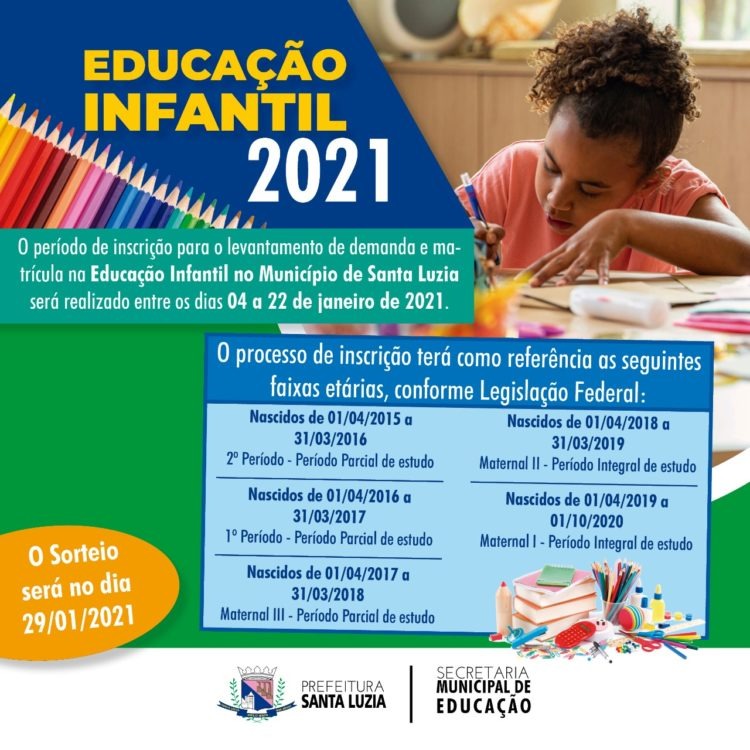 O início das inscrições para o levantamento de demanda da Educação Infantil no município de Santa Luzia para o ano de 2021 será entre os dias 4 e 22 de janeiro. O Sorteio será no dia 29 de janeiro de 2021.
