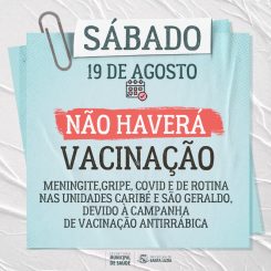 A Prefeitura de Santa Luzia, por meio da Secretaria Municipal de Saúde, informa que neste sábado (19), as Unidades de Saúde Caribé e São Geraldo não administrarão as vacinas de rotina, devido ao dia “D” da Vacinação Antirrábica de cães e gatos em Santa Luzia que será realizada no dia 19 de agosto, das 8h às 17h, em todas as unidades básicas de saúde (UBSs) do município. Os animais a partir de três meses de idade deverão receber a dose única anual da vacina, que previne contra a raiva.