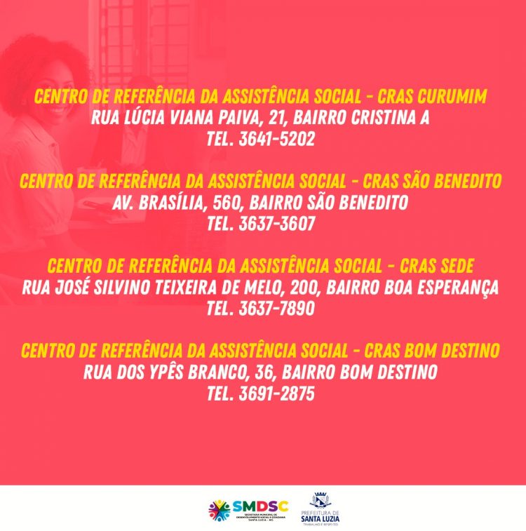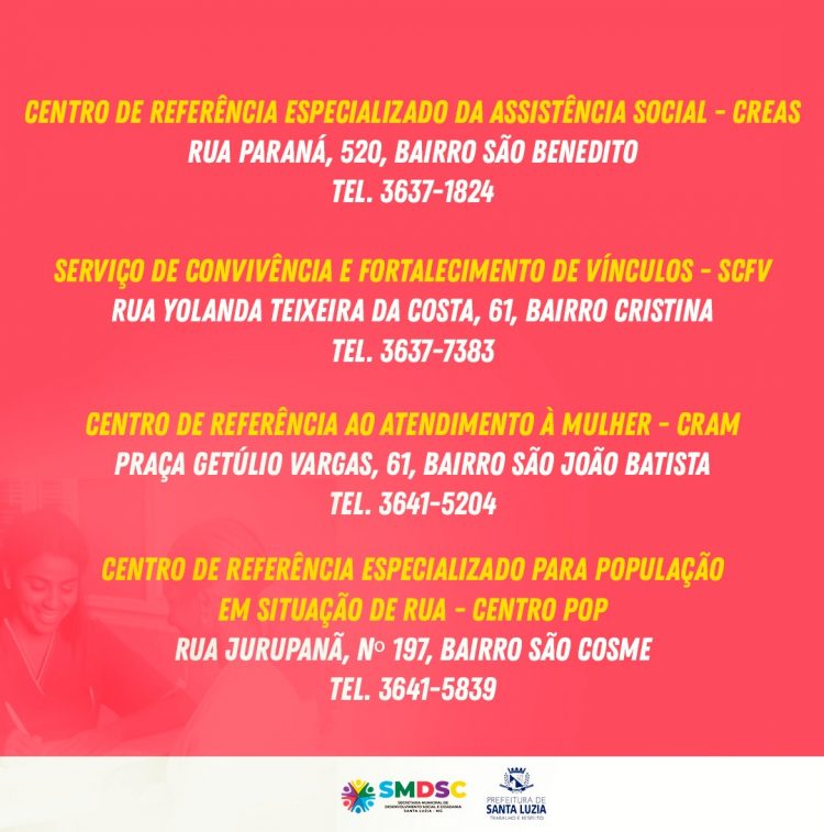 Está precisando de serviços de assistência social? A Prefeitura de Santa Luzia, por meio da Secretaria Municipal de Desenvolvimento Social e Cidadania disponibiliza todos os endereços e telefones dos equipamentos coordenados pela pasta. Fique ligado e salve os contatos: