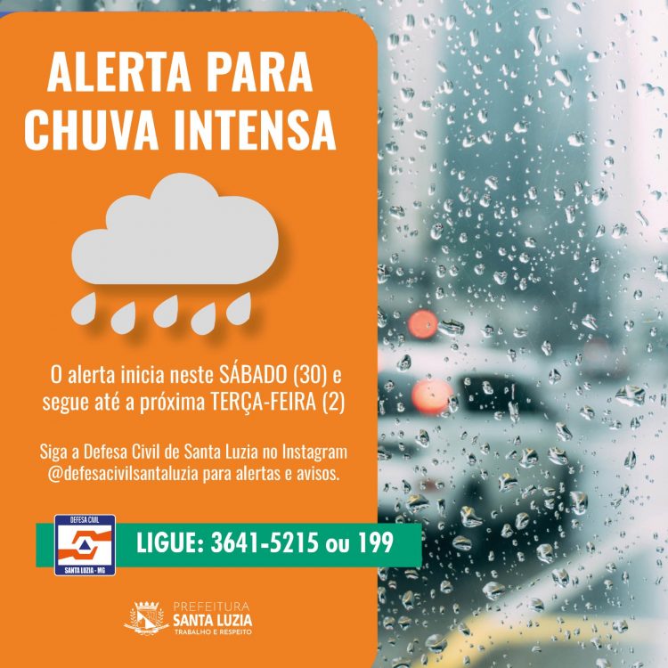 A Prefeitura, por meio da Coordenadoria Municipal de Proteção e Defesa Civil alerta para a previsão de chuvas intensas e acumulado significativo de chuvas, entre 80-125 mm/24h, para diversos municípios mineiros, incluindo Santa Luzia. O alerta inicia neste sábado (30) e segue até a próxima terça-feira (2), com destaque para os dias 31/12, 1º/01 e 2/01, nos quais a probabilidade de chuva intensa é maior. As informações são do Sistema de Meteorologia e Recursos Hídricos de Minas Gerais (Simge)/ Instituto Mineiro de Gestão das Águas (IGAM).