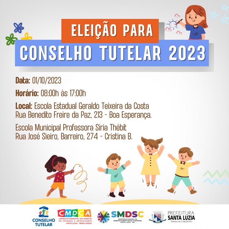 A eleição está sendo conduzida pelo Conselho Municipal dos Direitos da Criança e do Adolescente (CMDCA), com o apoio da Secretaria Municipal de Desenvolvimento Social e, acontecerá na Escola Municipal Professora Síria Thébit, na região do Distrito e na Escola Estadual Geraldo Teixeira Da Costa, região Sede, das 8 às 17 horas. No total, são 20 candidatos concorrendo a 10 (dez) vagas.