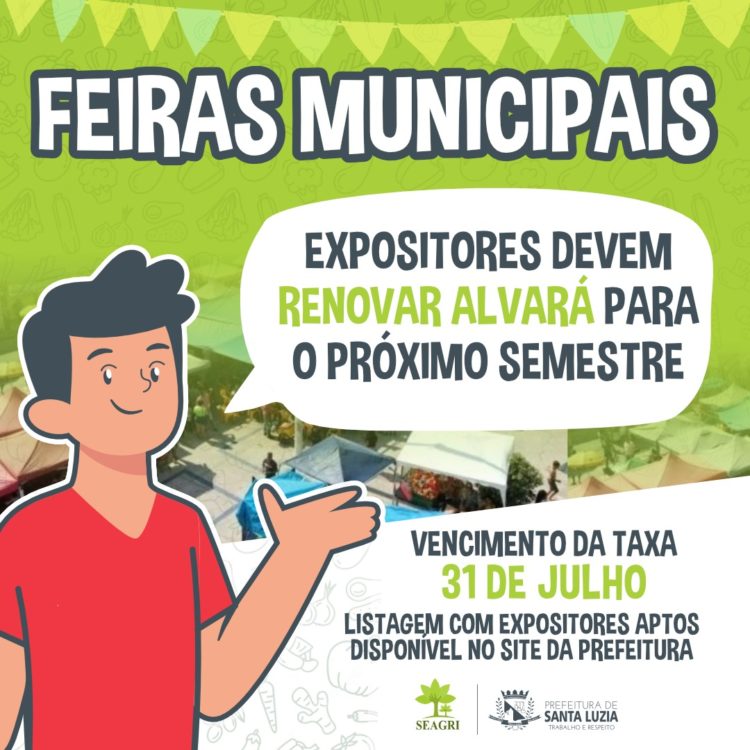 Os feirantes que desejam continuar expondo nas Feiras Livres Municipais de Santa Luzia, deverão solicitar a emissão de boleto para pagamento da taxa de alvará do segundo semestre, presencialmente, no Setor de Tributos da Prefeitura. O vencimento do boleto da taxa de alvará será dia 31/07/2023.