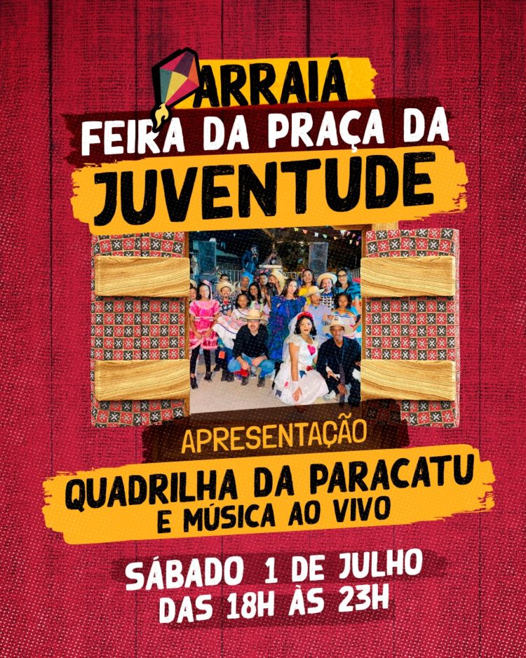No sábado (1), a Praça da Juventude será tomada pela alegria. O local será palco do “Arraiá” da Juventude, que será realizado das 18h às 23h. Além de brincadeiras, muita comida típica e a tradicional Feira Livre realizada semanalmente, ainda haverá a apresentação do grupo Quadrilha da Paracatu.
