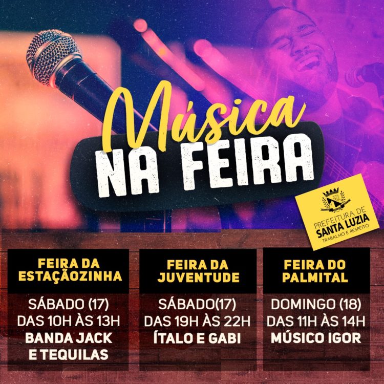 Neste final de semana, mais uma vez, as feiras livres da cidade estarão cheias de animação. No sábado (17), das 10h às 13h, a banda Jack e Tequilas estará animando a Feira da Estaçãozinha. Já na Feira da Juventude, também no sábado, a dupla Ítalo e Gabi se apresentará das 19h às 22h. No domingo (18), o músico Igor será o responsável por animar a Feira do Palmital, das 11h às 14h.