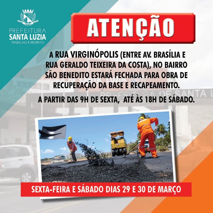 Retificando informação divulgada anteriormente, a Prefeitura de Santa Luzia, informa que: Nesta sexta e sábado (dias 29 e 30 de março), será realizada uma obra de recuperação da base e recapeamento na Rua Virginópolis, no bairro São Benedito. A ação acontecerá no entroncamento da via que fica entre a Avenida Brasília e Rua Geraldo Teixeira da Costa. Por isso, a via ficará fechada e o trânsito impedido, das 9h de sexta às 18h de sábado.