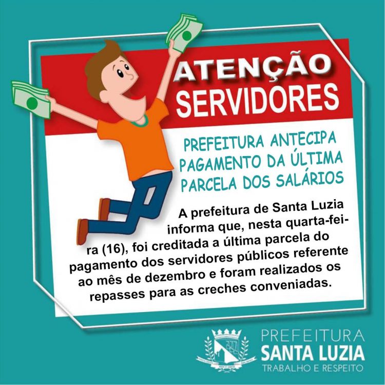 A prefeitura de Santa Luzia informa que, nesta quarta-feira (16), foi creditada a segunda e última parcela do pagamento dos servidores públicos, referente ao mês de dezembro, bem como foram realizados os repasses para as creches conveniadas. Mesmo diante da crise econômica, a Prefeitura não está medindo esforços para cumprir os compromissos com a folha de pagamento dos servidores.