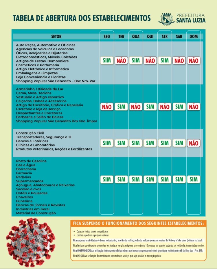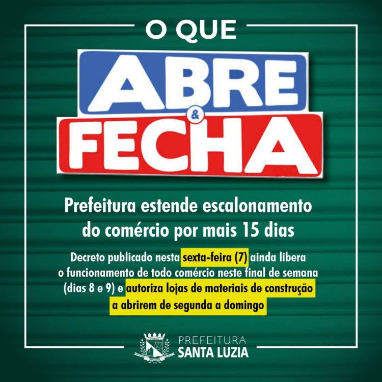 Em decorrência da pandemia do novo coronavírus, a Prefeitura de Santa Luzia estenderá o escalonamento do comércio na cidade. Porém, a medida estará em vigor a partir da próxima segunda-feira (10). É que neste final de semana, nos dias 8 e 9 de agosto, todos os comércios estão autorizados a funcionar. A partir de segunda, também poderão abrir todos os dias as lojas de materiais de construção. As novas normas são válidas pelos próximos 15 dias, e poderão ser estendidas ou restringidas de acordo com a evolução da covid-19 na cidade.