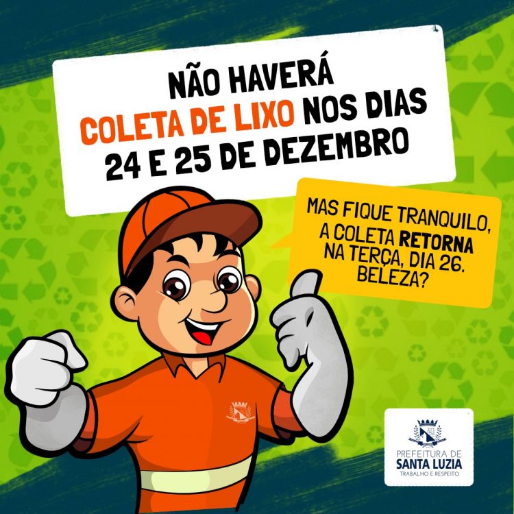 A Prefeitura de Santa Luzia, por meio do setor de Limpeza Urbana, informa à população que não haverá coleta no feriado de Natal (dias 24 e 25 de dezembro). Portanto, solicita à população que não coloque os resíduos nas calçadas para evitar que animais espalhem o lixo.