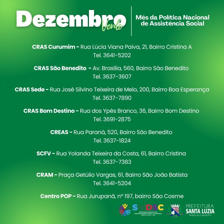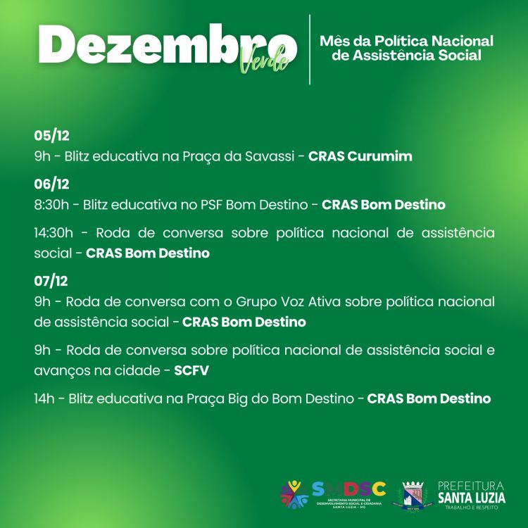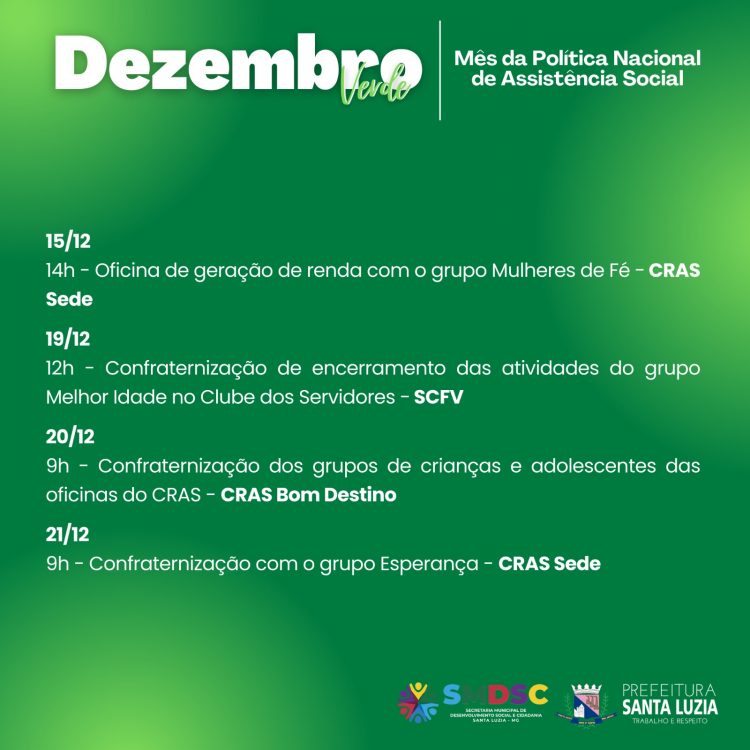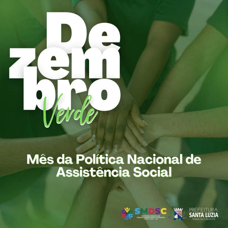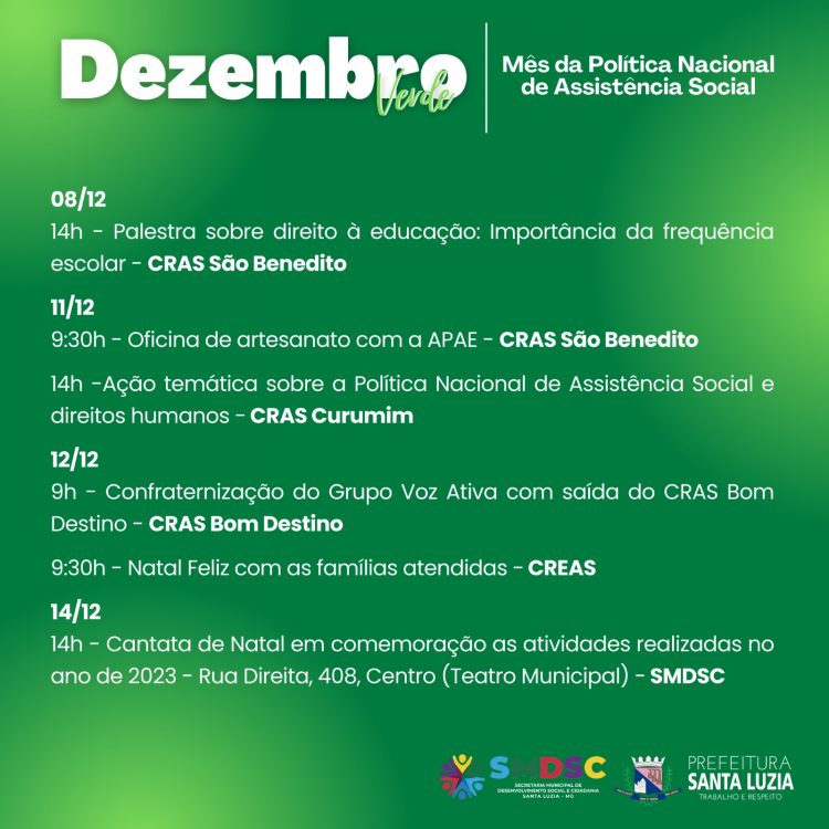 A Prefeitura de Santa Luzia, por meio da Secretaria de Desenvolvimento Social e Cidadania, apresenta o calendário de ações do Dezembro Verde – mês da Política Nacional de Assistência Social – e convida toda a população a participar desses eventos.