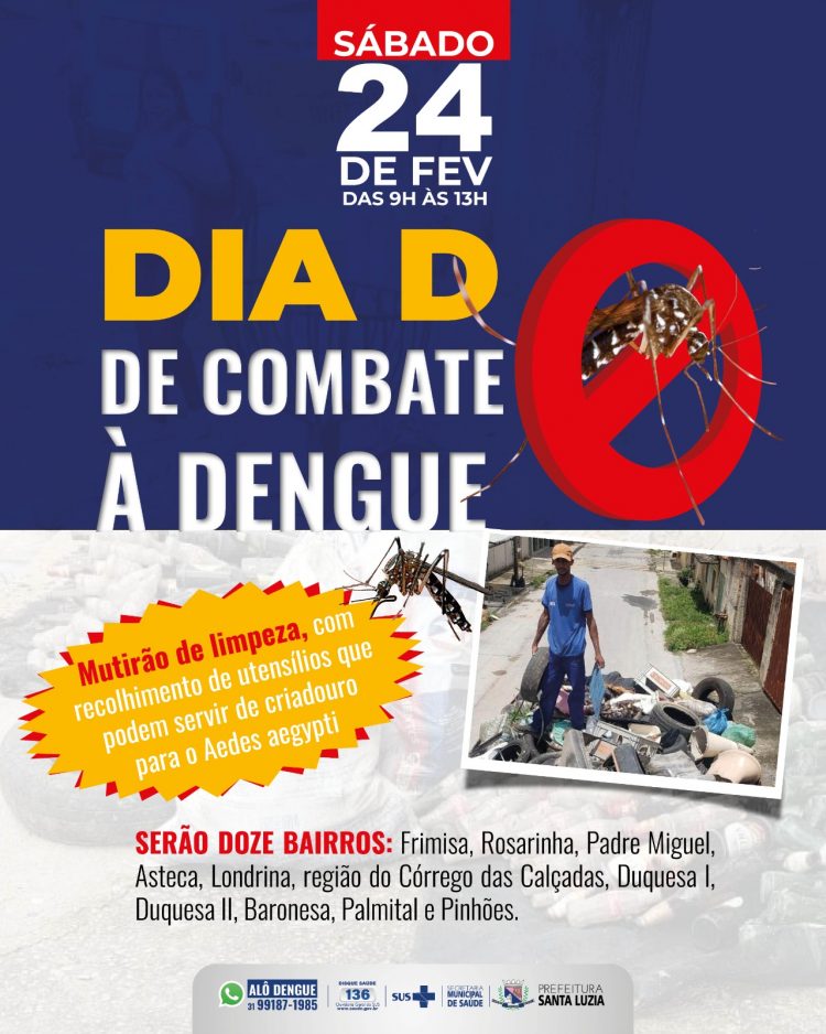 A Prefeitura de Santa Luzia está trabalhando de forma incansável para conter o avanço dos casos de dengue na cidade. Por isso, no próximo sábado (24), das 9h às 13h, será realizado o “Dia D” de combate ao Aedes aegypti, mosquito transmissor de arboviroses como a dengue, chikungunya e a zika.