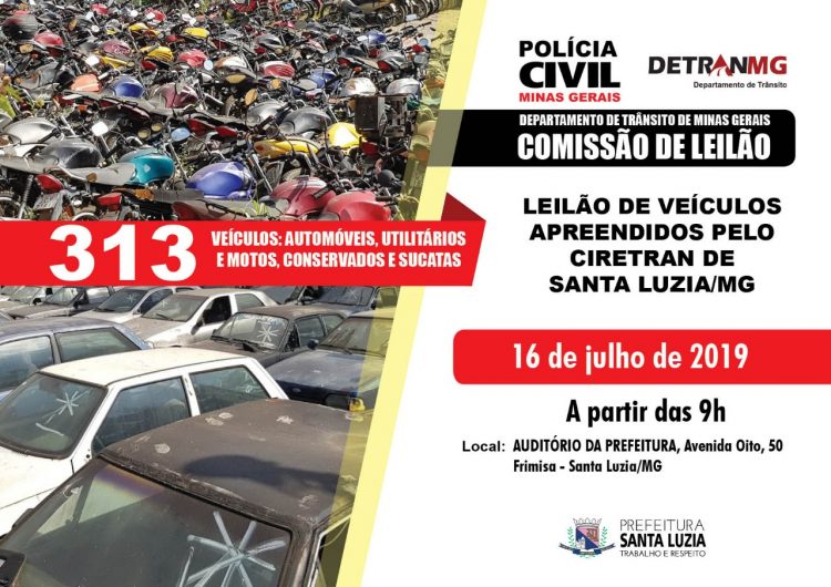 O leilão será conduzido por leiloeiro oficial credenciado pelo DETRAN da capital e os veículos são todos frutos de apreensões feitas em Santa Luzia.