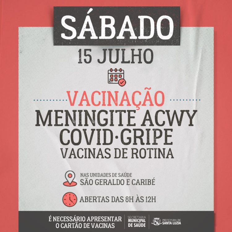 Neste sábado (15) terá vacinação nas unidades básicas de saúde São Geraldo e Caribé. Estarão disponíveis vacinas contra a covid-19, gripe, meningite ACWY (agora disponível para pessoas com idade a partir dos 16 anos) e vacinas de rotina. É necessário apresentação do cartão de vacinas e pessoas menores de 18 anos devem estar acompanhados dos pais ou responsáveis.
