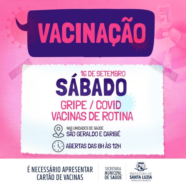 Se você ainda não completou seu esquema vacinal, aproveite o próximo sábado (16) para fazer isso. As unidades básicas de saúde São Geraldo e Caribé estarão abertas das 8h às 12h, disponibilizando imunizantes contra a covid-19, gripe e vacinas de rotina. É necessário levar o cartão de vacinas e pessoas menores de 18 anos devem estar acompanhadas dos pais ou responsáveis.